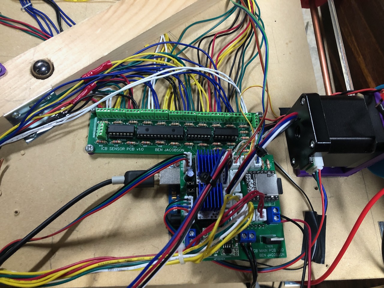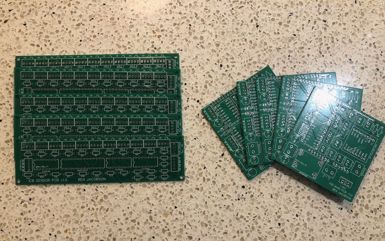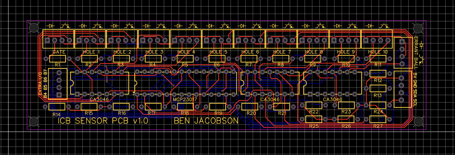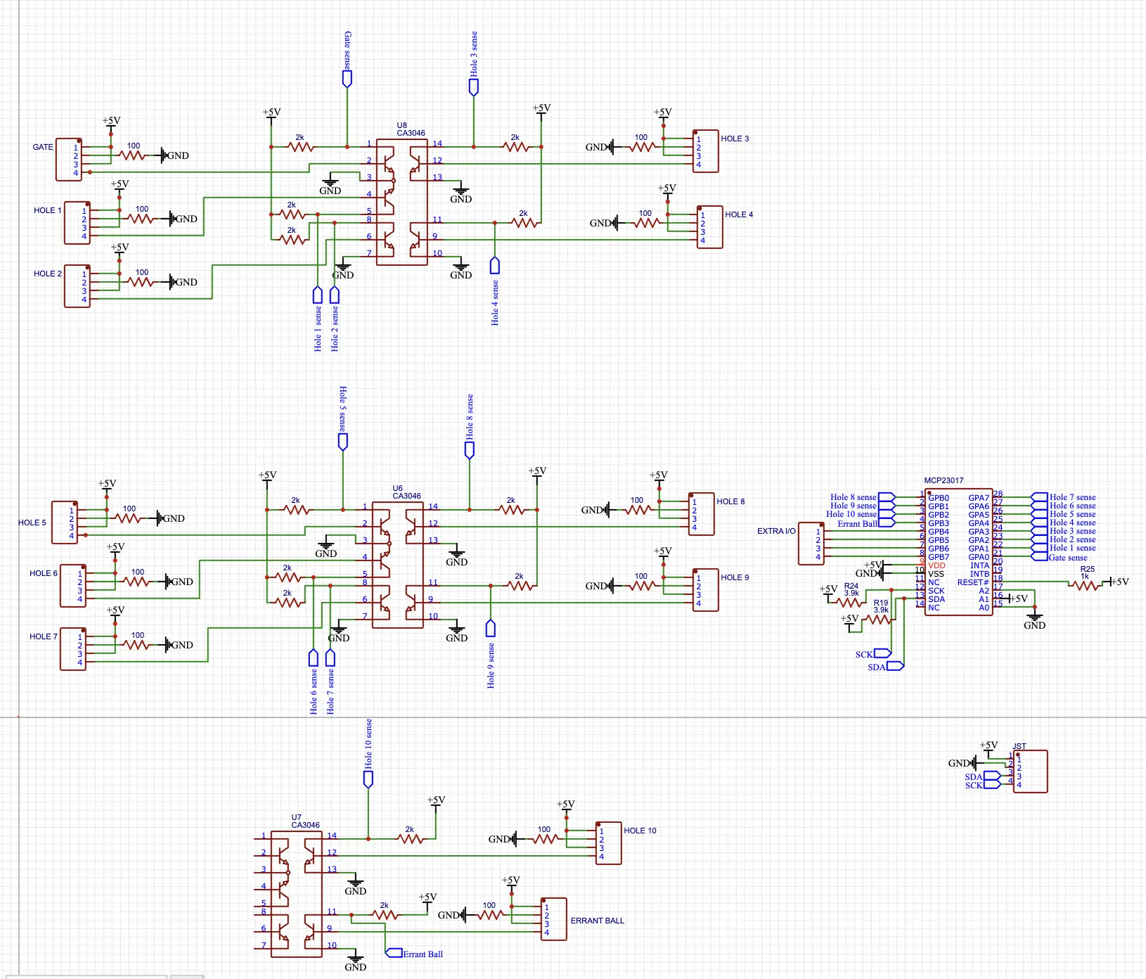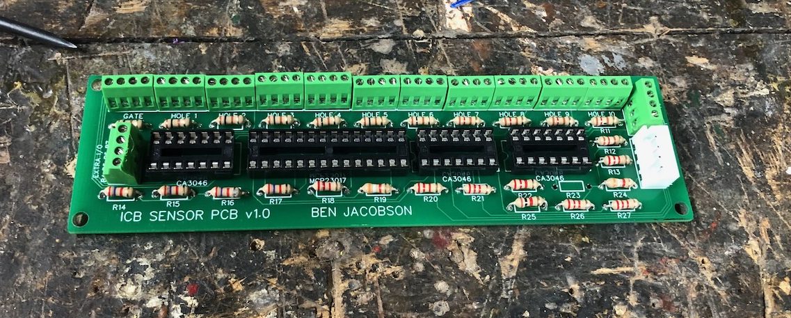 Another circuit board, which I named “ICB Sensor PCB” is responsible for dealing with all of the infrared sensors for the target holes and gate hole. Each pair of IR sensors connects to a neatly labeled screw terminal with the proper polarity indicated via a silkscreened diagram. The board has all the proper resistors for the IR emitters and the transistor array integrated circuit chips that amplify the signals from the receivers. Lastly, it’s home to an IO expander, just like on the light protoboard, so the only connection between the sensor PCB and Arduino is a two-wire I2C bus and 5V power.