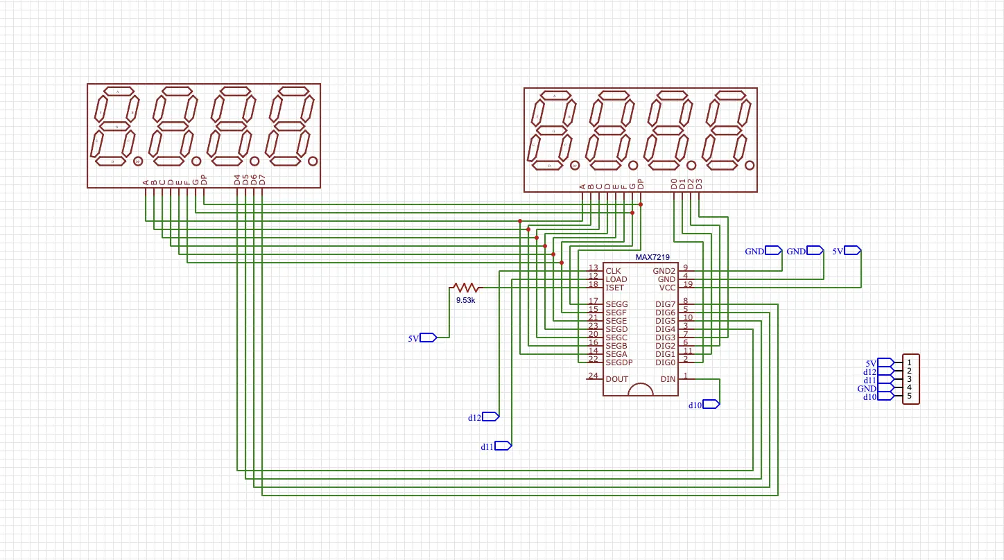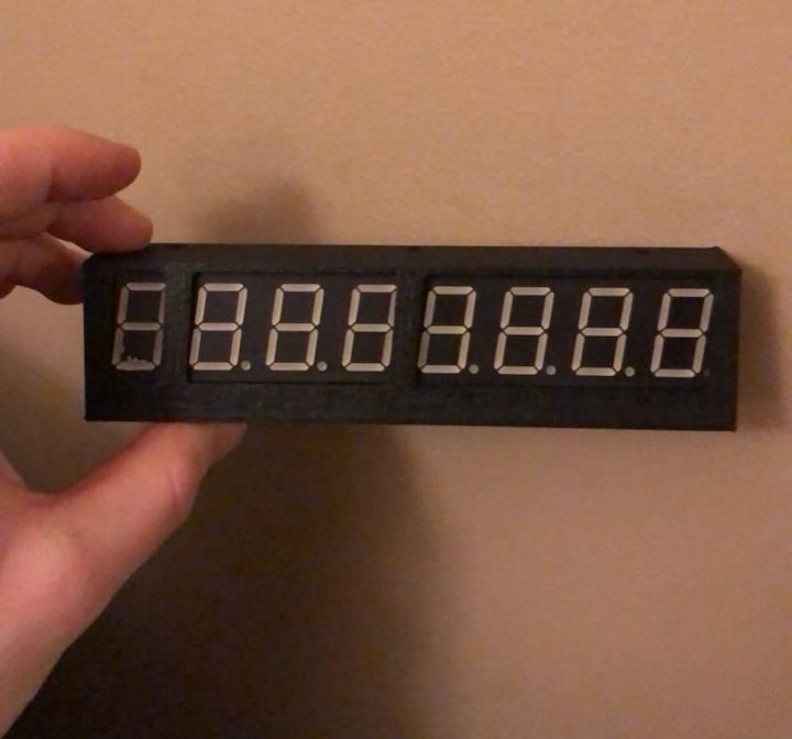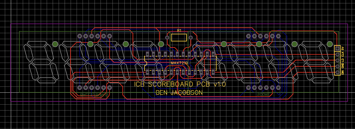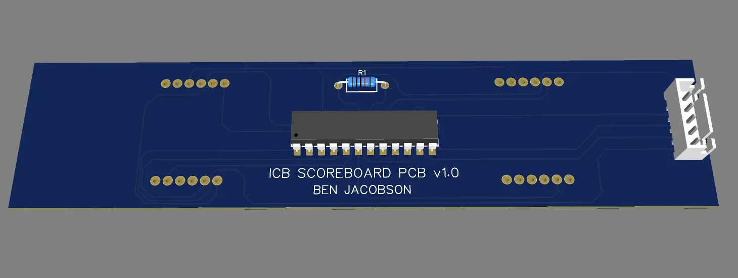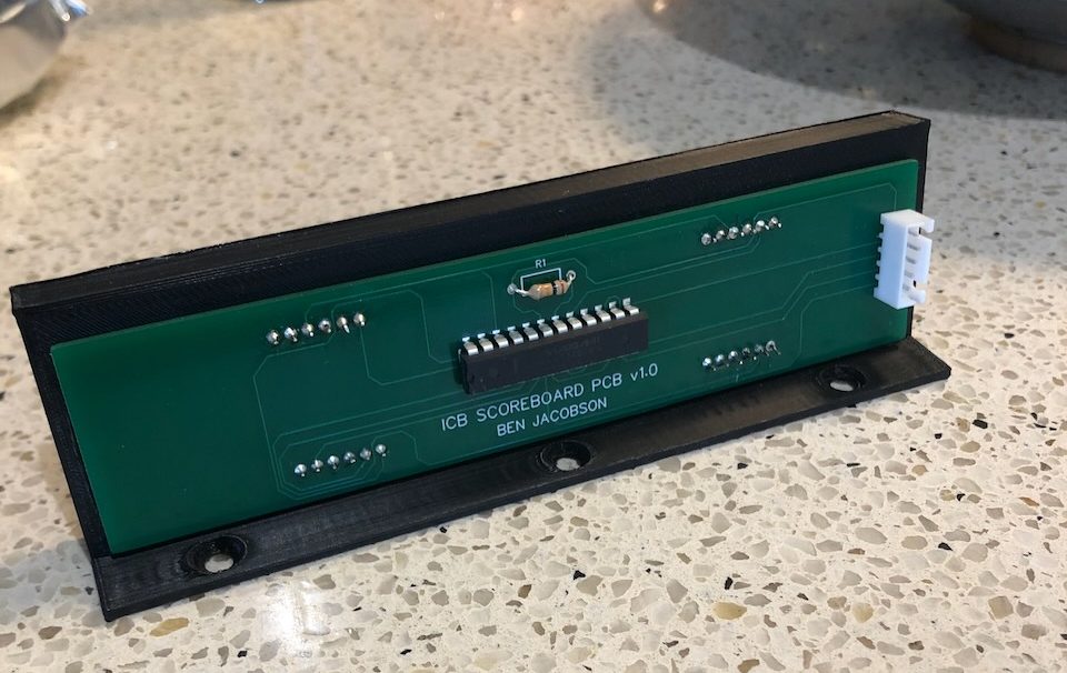 The last circuit board, which I named “ICB Scoreboard PCB” houses the two four-digit seven segment displays and MAX7219 driver chip that controls them. This board slots directly into the 3D printed scoreboard mount, and it only has a five-wire connection to the Arduino.