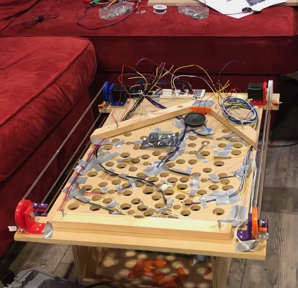 While the game is in the “gsBallAtGate” state, the bar is sent down to retrieve it until the gate sensor detects that the ball has left the gate, when the state is changed back to “gsBallOnPlayfield”. While the game is in the “gsAttractMode” state, the serviceLEDPattern() function gets called repeatedly which uses a BlockNot timer to iterate through a pre-determined sequence of light states that creates a nice visual effect. A very similar function is called to scroll through text (a char array) on the scoreboard. There are many other subtleties involved in the code, but hopefully this overview sheds enough light on the inner-workings.