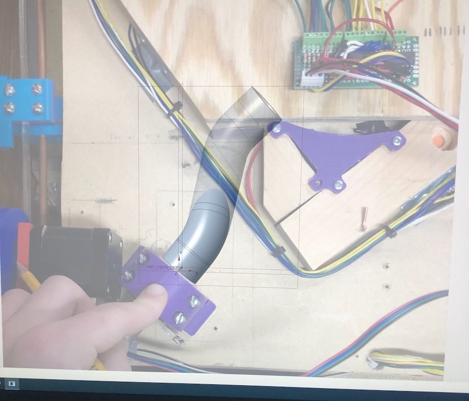 In very rare cases, it’s possible for the ball to fly forwards off the bar and get stuck in the front of the machine. This is true of the original as well. To combat this, I spent months calculating, designing, and building a solenoid-based return system to shoot the errant balls back in play. When a ball falls off the bar, it falls onto a wooden board attached to the front of the playfield that funnels it to a hole that sends it to the back. From there, it enters a 3D printed chamber and trips an IR sensor, causing the solenoid to energize which forces the steel plunger into the coil and pushes the ball through the 3D printed tube back into play. To optimize the geometry of the tube, I took reference pictures of the playfield and used PTC Creo to project a 2D sketch onto a curved surface to create a 3D sketch that I could sweep a circular profile through. Unfortunately, all this hard work went to waste because the solenoid overheated and burned the playfield, so I decided to scrap the idea. The case of the ball falling ended up being very rare and has proven to not be an issue.