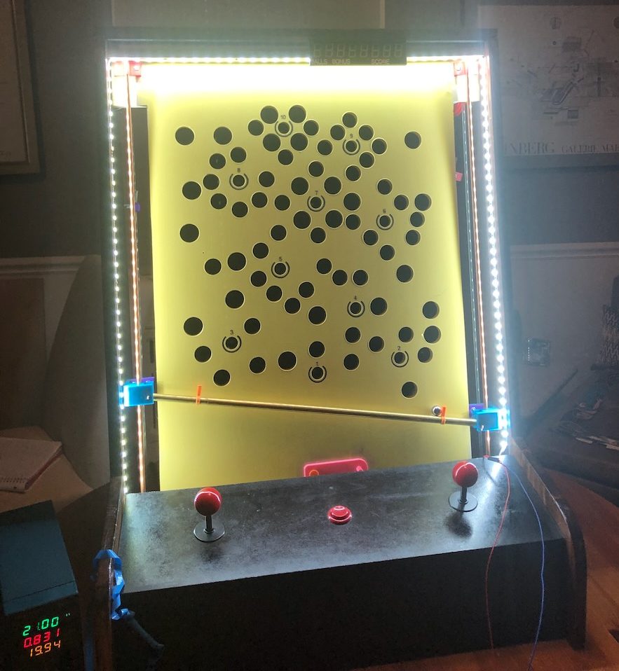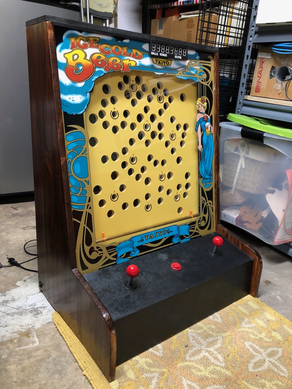 Taito's Ice Cold Beer (1983): tilt a bar to roll a steel ball up a pegboard and land it in a target hole. Original cabinets were selling for $2,000+ — an obvious build challenge.