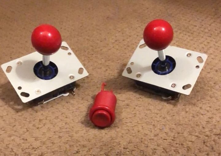 I decided to make the control panel out of the same MDF as the playfield. The top piece of the control panel houses the two joysticks and start button, so I drilled those holes out first before using a circular saw to create the miter cuts to situate everything at the desired angles.