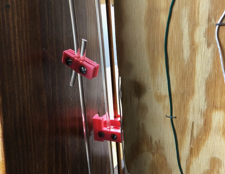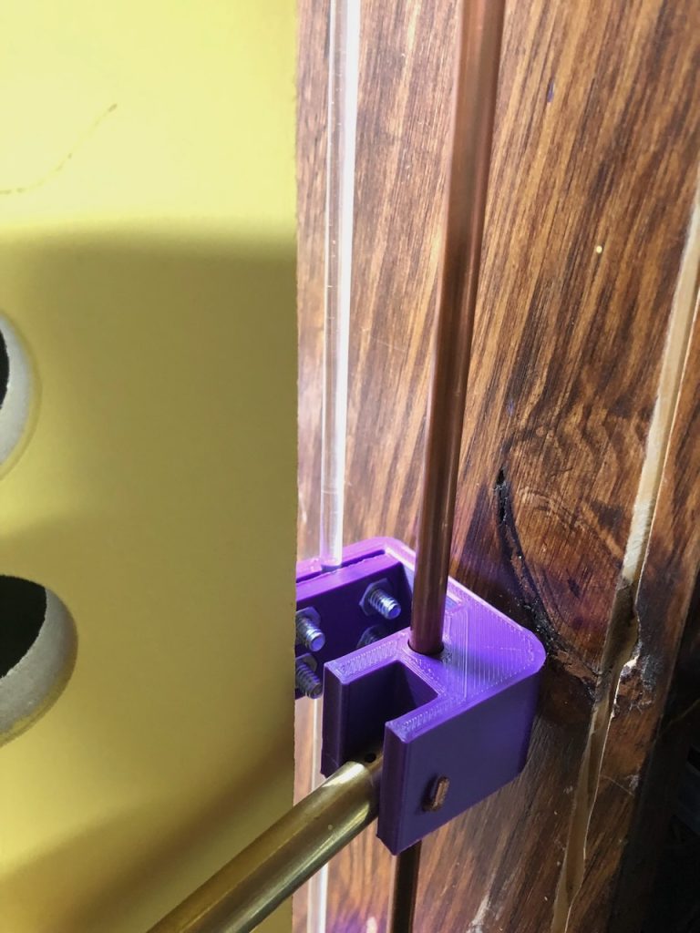 Clamped to these belts are 3D printed pieces that clamp to the belt using machine screws and captive hex nuts, slide along the copper guide rod, and allow the brass bar to pivot. I developed at least ten different iterations of this part, to alleviate problems with clamping, sliding, proper bar-playfield gap, and limit switch triggering. As each side of the bar gets pulled in different directions, the bar will naturally telescope appropriately. The belt is cut and gets held in another 3D printed part so it can be tensioned in case it stretches out over time.