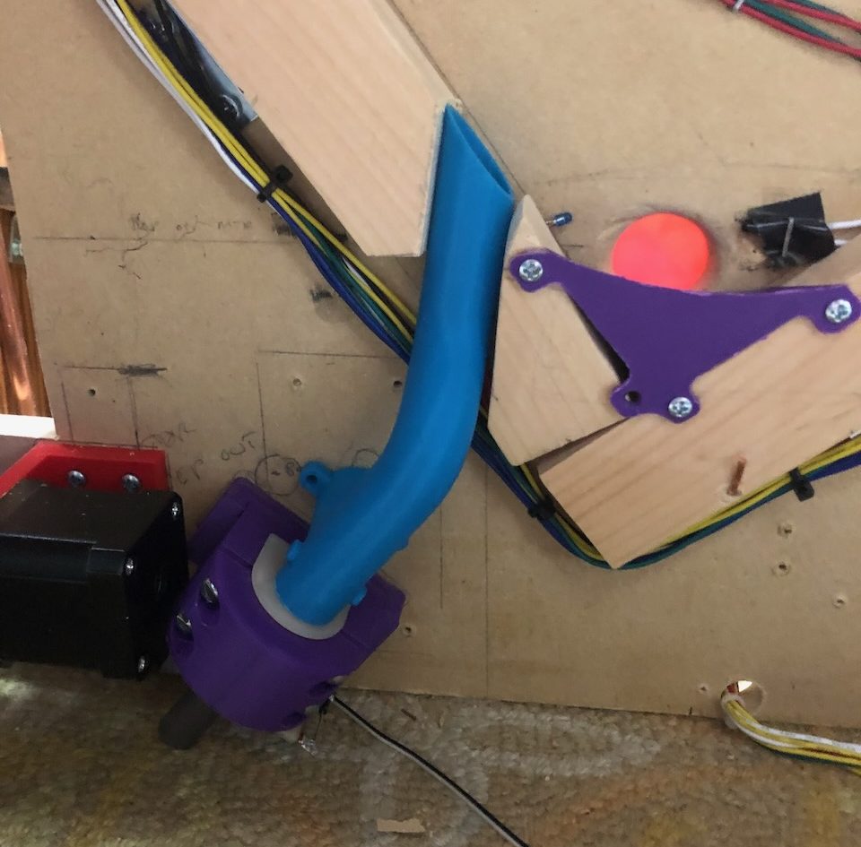 My version takes a much simpler, albeit louder, approach: when the ball enters a hole on the playfield, it falls down until it hits into one of two angled wooden boards that funnel it back to the gate. Since the entire playfield is tilted back ten degrees, I needed a special 3D printed part to bias it forward against the ball gate.