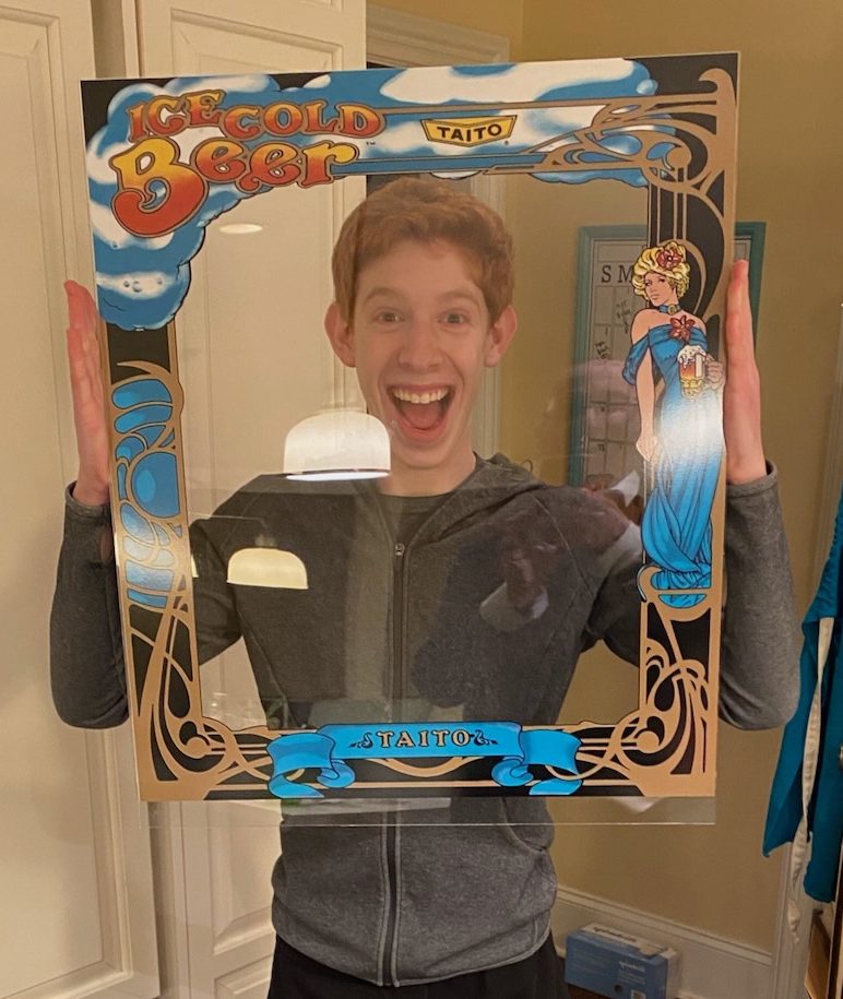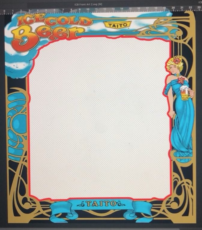 The next step was to install an acrylic panel with artwork. I used a Dremel to route out slots in both sides of the cabinet for the acrylic panel to slide in. In terms of the artwork, I found a copy of the original online, but there were two problems. First, when I started making the machine, I never intended to have artwork, so I didn’t stick to the same dimensions as the original. Second, the artwork I found online was too low resolution to be printed at the scale I needed. I ran the artwork through an AI vectorizer that took the rasterized, pixelated image and turned it into a scalable vector graphic, comprised of curves. Then, my friend Jake helped me manipulate the artwork to fit the proper dimensions of my machine. I got it printed as a vinyl sticker and the vendor used a laser to precisely cut out the inside of the artwork to the boundary line I created.