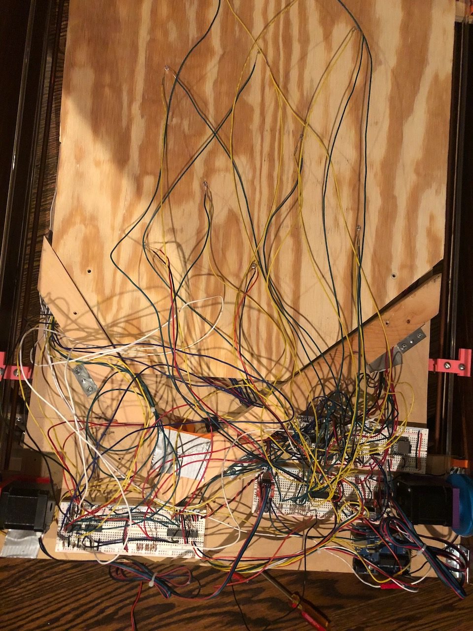 There are four limit switches on the machine that act as end stops. When the bar is fully extended to one extreme, a limit switch is closed, and the motor is stopped. Since the motors are steppers, only two limit switches are necessary since the machine homes itself at the bottom and knows how many steps it can travel before hitting the top of the machine. However, for redundancy and in case any steps are skipped, the machine has four.