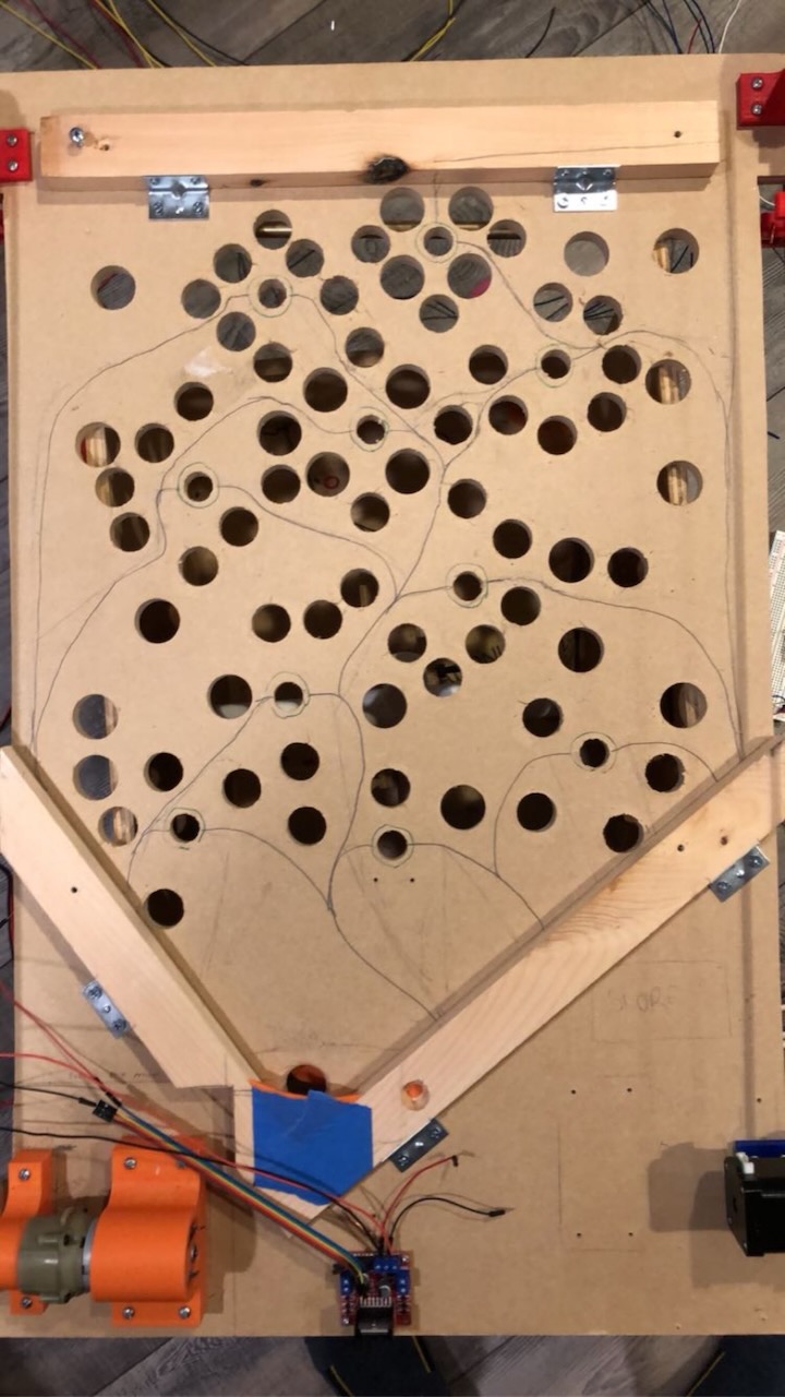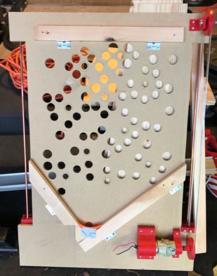 In order for the Arduino to know which hole the user got the ball in, some sort of sensor is required. A sensor behind each hole, though, would be far too complex. In reality, only 11 sensors are needed: one for each of the ten target holes, and one for the ball gate at the bottom of the playfield. If the gate sensor is triggered without the proper target hole sensor being triggered prior, the machine knows the user got the ball in the wrong hole.