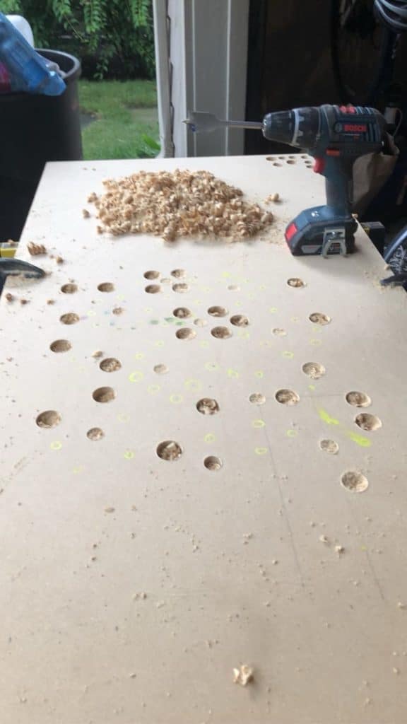 To make the playfield, I got a 1/2 in. x 2 ft. x 4 ft. MDF sheet and three spade bits for my cordless drill. I used a T-square to measure and mark out each hole, color-coding the three different diameters on the MDF sheet. I then drilled each hole by hand with the spade bits and cut out the shape of the playfield with a circular saw.