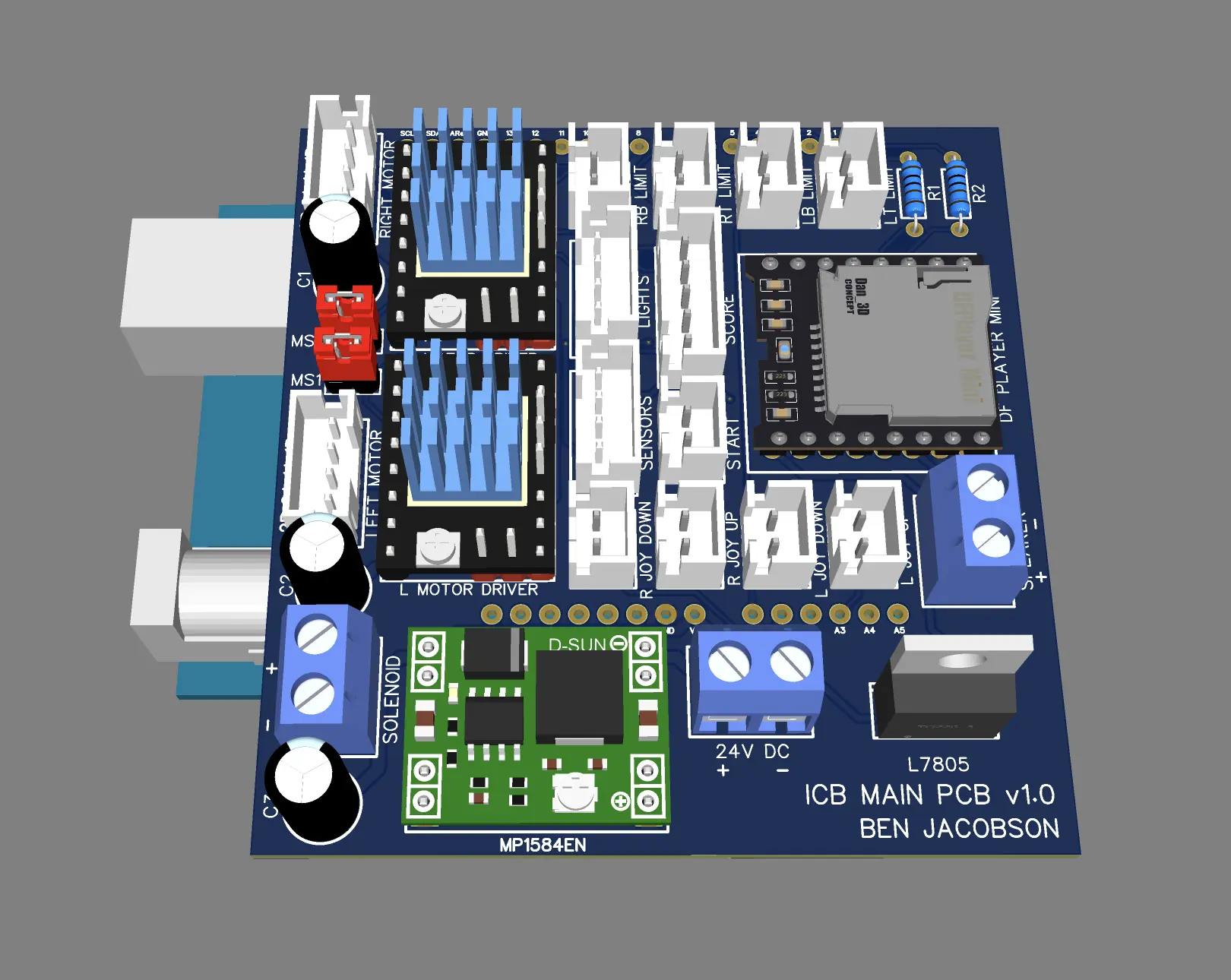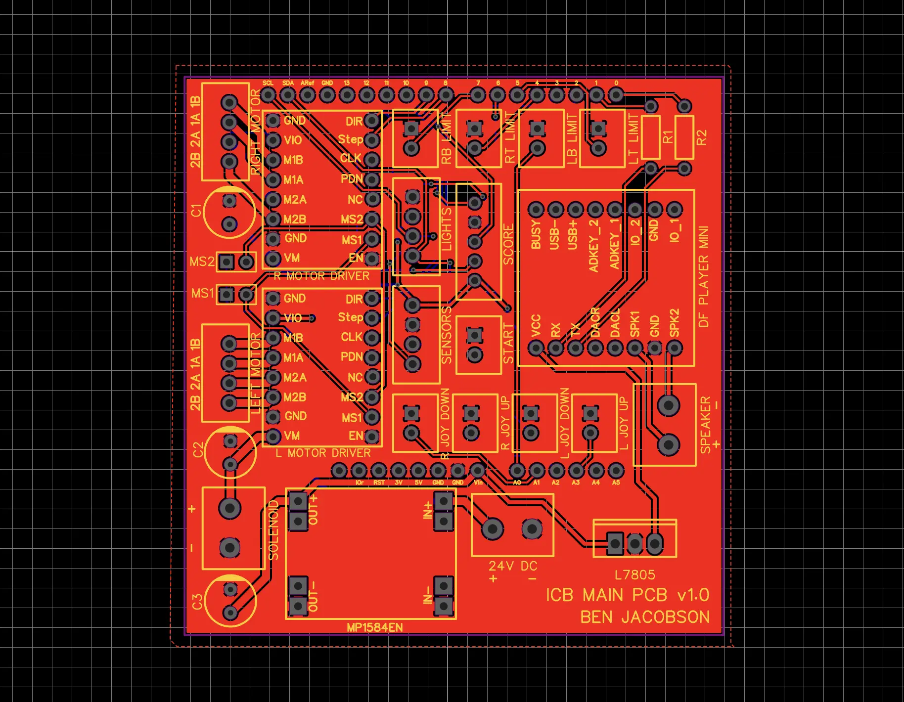 The main circuit board, which I named “ICB Main PCB” is actually designed to sit right on top of the Arduino Uno, sort of like a shield. Its job is to have clearly labeled terminals for the main inputs/outputs that internally route to the proper pins of the microcontroller. It also directly houses the two stepper drivers and MP3 audio player. All connections to external boards are made with removable JST connectors that I crimped by hand.