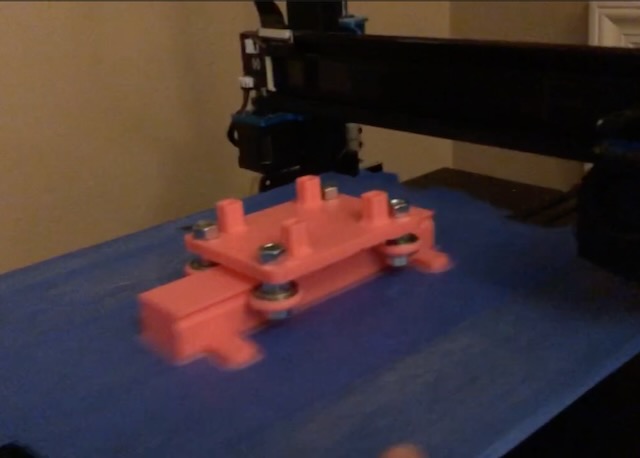 A 3D printed linear roller mechanism allows the building model to slide freely in the direction of simulated ground motion while supporting its full weight vertically.